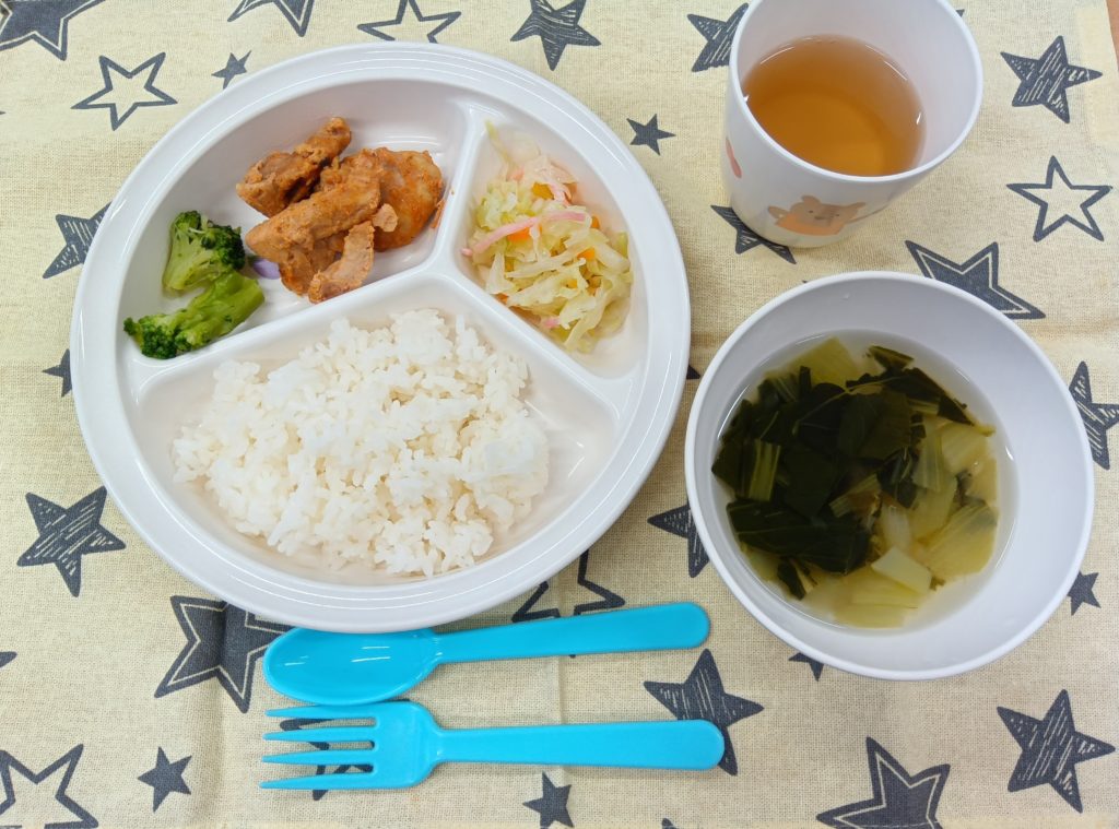 献立:御飯、青梗菜のスープ、タンドリーチキン、コールスローサラダ