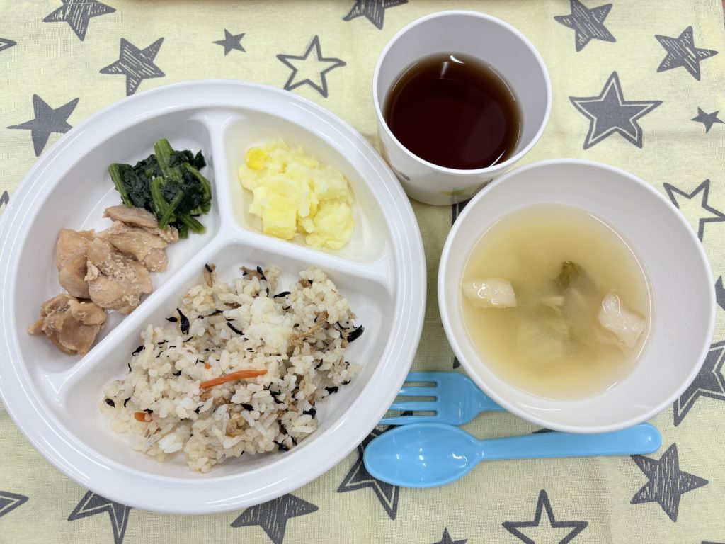 献立:ひじきご飯、みそ汁(白菜・麸)、鶏肉の甘辛煮、コーンポテト