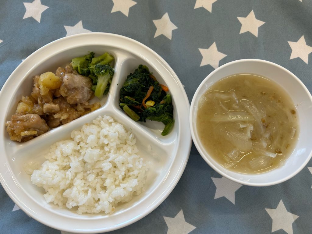 献立:白米、チキンチキンポテト、ブロッコリー、なめことタマネギの味噌汁